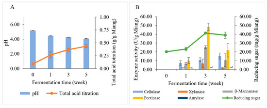 Changes in biochemical and polysaccharide-degrading enzymes during Miang fermentation: pH (bar chart) and total acid titration (linear line) (A). Enzyme activities (bar chart) and reducing sugar (linear line) (B). nd represents no enzyme activity was detected.
