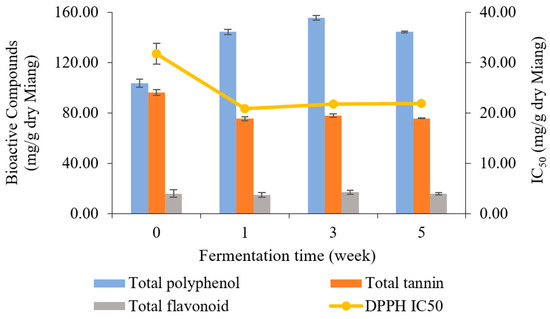 Changes in total polyphenol, total tannin, total flavonoid (bar charts), and antioxidant activity represented by IC50 (linear line) during Miang fermentation.