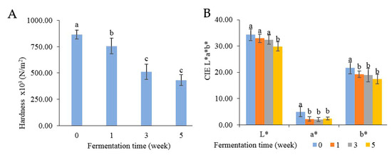 Changes in physical properties: hardness (A) and color (B) during Miang fermentation. The superscript letters indicate statistical significance (p < 0.05).