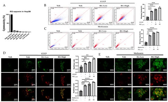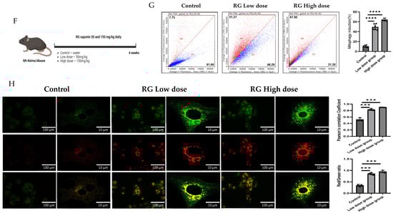 Investigations into the effects of ginsenosides from Red Korean Ginseng on mitophagy involved cellular and in vivo studies using Mt-Keima Hep3B cells and primary hepatocytes treated with 20 µg/mL (RG Low) and 40 µg/mL (RG High) ginsenoside concentrations, which were selected based on cytotoxicity assays conducted on hepatocytes to ensure effective yet non-toxic doses. (Figure 1A). Results, depicted in Figure 1B–E, showed a clear dose-dependent increase in mitophagy across both cell types, demonstrating ginsenosides’ significant role in enhancing mitophagy activity.