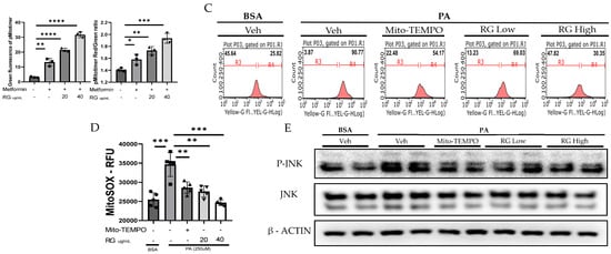 RG Ginsenosides decrease production of mtROS and tROS. (A) Microscopic imaging showcased mitochondrial biogenesis in Hep3B cells transfected with the pMitotimer plasmid. (B) mtROS and total ROS levels were monitored in Hep3B cells after 16 h of treatment with palmitic acid (PA) alone or in co-treatment with RG saponin. (C) Flow cytometry was utilized to detect mtROS production in Hep3B cells following treatment with PA and RG saponin. (D) Colorimetric analysis of MitoSOX-stained Hep3B cells was conducted to quantify mtROS levels. (E) Western blot analysis was performed to evaluate the protein expression of P-JNK as an oxidative stress marker after co-treatment with PA and RG saponin. The data are expressed as means ± SEM, with significance denoted by * p < 0.05, ** p < 0.01, *** p < 0.001 and **** p < 0.0001.