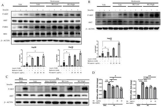 RG Ginsenosides improves Insulin sensitivity and attenuate Gluconeogenesis. (A,B) Western blotting analysis of insulin sensitivity markers P-IRS, IRS, P-AKT, AKT in Hep3B and HepG2 cell lines. Cells were treated with RG saponin for 24 h and were stimulated with 10 nM Insulin for 15 min before collection. (C) Western blotting demonstrated P-AKT expression in Primary Hepatocytes after treatment with PA and RG saponin. (D) mRNA expression analysis of genes involved in gluconeogenesis, G6Pase, PEPCK. The data are expressed as means ± sem. * p < 0.05, ** p < 0.01, **** p < 0.0001.