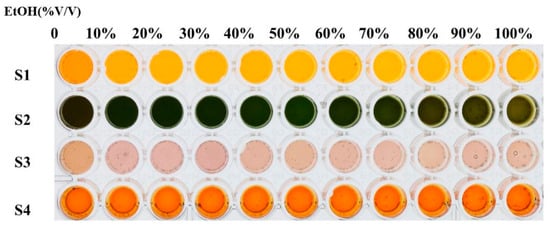 Since the ethanol content in commercial baijiu samples was usually between 30–60% (v/v%), the investigation of ethanol’s impact on the sensor array was imperative to guarantee response accuracy. Ten different concentrations (v/v%) of ethanol from 10% to 100% were selected for the colorimetric reaction. It can be observed in Figure 1 that when high concentrations of ethanol were present, the final color rendering of the sensor array became a little shallower than that of the pure water reaction. However, when ethanol concentrations ranged from 30% to 60%, the color rendering of the sensor array did not change significantly, indicating that the array was basically unaffected by ethanol concentration in commercial baijiu samples. Due to the fact that most of the commercial baijiu samples involved in this study owned an ethanol content of 52%, 52% ethanol was selected as the control group during the process of baijiu analysis.