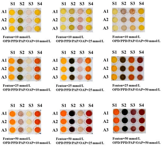 Fenton reagent is a strong oxidizing system composed of hydrogen peroxide and ferrous ions, which can oxidize organic substances such as carboxylic acids and alcohol to an inorganic state. As shown in the following reaction equation, the main oxidizing agent in the Fenton reagent is the hydroxyl radical. Fenton reagent has the following characteristics: strong oxidizing ability, fast decomposition of hydrogen peroxide into hydroxyl radicals, and high oxidation rate []. On the other hand, phenol and aniline compounds can be oxidized by the Fenton reagent and further show different color changes []. When reacted with o-phenylenediamine (OPD), p-phenylenediamine (PPD), 4-aminophenol (PAP), or 2-aminophenol (OAP), the Fenton reagent can show obvious color changes before and after the reaction. Interestingly, this color reaction could be disturbed by the presence of organic acids [], thus presenting either a unique color rendering mode that has the potential to be utilized in the examination of various organic acids or the color fingerprint for the analysis of different baijiu samples. However, this phenomenon is rarely used in any visual sensor array system according to the available literature.