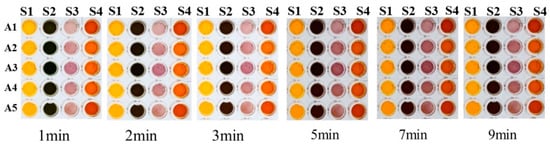 First, the dosage of the Fenton reagent and reducing agent in each channel was optimized, and the color rendering results after the addition of benzoic acid (A1), lactic acid (A2), or acetic acid (A3) are shown in Figure 2. When the Fenton reagent and reducing agent concentration were too large, it was easy to cause the color after the reaction to become too dark and potentially precipitate problems. On the other hand, when the concentration of the Fenton reagent and reducing agent was too small, it could lead to a light color rendering, resulting in difficulty in producing color difference responses to different organic acids. Thus, the concentration of FeCl2 and H2O2 used in the Fenton reagent was finally set as 25 mmol/L, while the concentrations of four reducing agents, including OPD, PPD, PAP, and OAP, were all set as 25 mmol/L to obtain the specific color difference of different acids. Subsequently, the response time of the sensor array towards organic acids was meticulously fine-tuned to achieve rapid visual analysis. The color rendering outcomes of the sensor array are displayed in Figure 3 for different reaction durations following the addition of benzoic acid (A1), lactic acid (A2), acetic acid (A3), butyric acid (A4), or isobutyric acid (A5), and the reaction time was finally selected as 5 min to obtain the best color rendering effect.