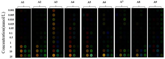 The 15-W LED plate was covered with an opaque black cloth, and a section equal to the size of the 96-well plate was precisely removed from the center, resulting in only this specific area being uniformly illuminated by a white backlight. The 96-well plate was positioned within the designated area, and photographs were captured under dark conditions using a Canon EOS 750D digital camera. The camera was equipped with a Canon EFS 18–135 mm zoom lens and securely mounted on a tripod. The images were captured using a consistent shutter speed of 1/125 s, an aperture setting of f/11, and ISO sensitivity set at 400. The camera parameters, distance between the LED panel and the camera, intensity of light emitted by the panel, and level of darkness in the indoor environment were consistently controlled to minimize any potential variations in color representation across different images. To ensure consistent color and minimize variations in the borders, Adobe Photoshop was employed to calculate the mean RGB value of a circular region (with a diameter of 25 pixels) located at the center of each well, and the RGB value matrix was obtained. The RGB value matrix refers to a 3D matrix of size m × 4 × 3, where m is the number of samples, 4 is the number of sensors, and 3 represents the R, G, and B values of the color []. The determination of the color vector matrix (ΔRGB) involved a comparison between the RGB values obtained from the response group and those from the control group. In addition, for the purpose of visual representation only, the RGB range was expanded to a scale of 0–255 in order to generate color differentiation diagrams. The RGB values utilized in the data analysis remained unamplified and were based on the original differences observed. All experiments were conducted in parallel, with six repetitions each, and a total of four sets of images were captured throughout the measurement process. Hence, a comprehensive dataset comprising 24 sets of parallel RGB data was utilized for color difference diagrams and chemometrics analysis.