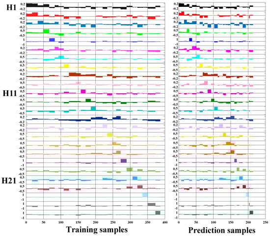 The procedure of PSO-VWLS-SVM model [] can be summarized as follows: Step 1—starting with an initial set of 100 feasible solutions for the weighting vector of the variables, along with two hyperparameters (kernel widths and the relative weight assigned to the error term) in LS-SVM, a model based on LS-SVM is developed to establish a correlation between the predictor matrix and the target variable being predicted; Step 2—PSO is utilized to investigate different weighting vectors and two hyper-parameters with the aim of minimizing the prediction error, which is assessed using root square mean; consequently, the optimal combination of fingerprint variable weights for each component are obtained; Step 3—utilizing the most finely tuned variable weighting vector and hyper-parameters identified in Step 2, we construct an LS-SVM model and subsequently employ it on unfamiliar samples.
