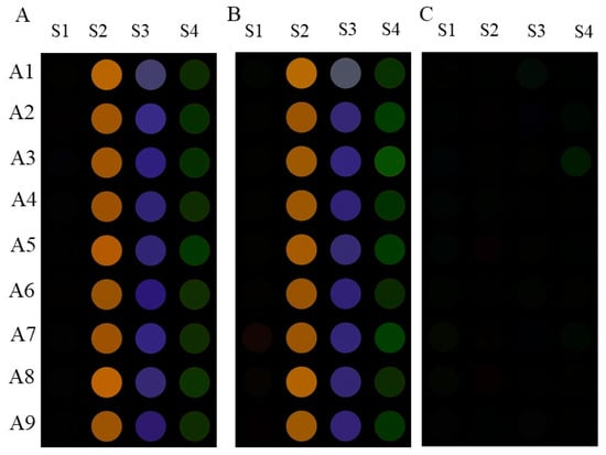 Traditional methods for baijiu assessment, such as chromatography [,,,], spectroscopy [,], e-nose [,,], etc., mostly have problems such as expensive equipment, long analysis time, or relying on precision instruments. On the contrary, the visual sensor array, with the advantages of simple equipment, fast analysis speed, and cross-response, has been more and more widely employed in the accurate analysis of baijiu and its flavor compounds [,]. Accordingly, the visual sensor array element materials are mainly composed of chemical response inks [], sensitive dyes [,,], pH indicators [], or nano materials [,,,,,]. Suslick et al. developed metalloporphyrin chemical array sensors that can specifically identify various volatile substances based on the changes in color before and after the sensitive material reacts with volatile organic compounds []. Li et al. developed a three-channel simple colorimetric sensor array to differentiate between four categories of Chinese base liquor (Luzhou Laojiao), nine varieties of baijiu with distinct flavor profiles, and seven types of baijiu with different geographic origins []. Li et al. developed a sensor array utilizing the etching of silver nanoprisms (Ag NPRs) regulated by metal ions to successfully differentiate between 16 types of Chinese baijiu []. Recently, Wu et al. established a colorimetric sensor array using silver nitrate and o-phenylenediamine derivatives, which was specifically designed to detect carbonyl flavor compounds. This innovative approach proved effective in distinguishing different types of Chinese baijiu []. However, most visual sensor arrays focused only on either baijiu identification or adulteration assessment and fail to integrate these two important functions together.