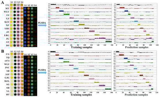 As shown in Figure 7A, the color difference diagrams of the sensor array following the inclusion of baijiu samples were more obvious than those of the single organic acid tested above due to the higher total acid content and synergistic effect of different organic acids. Compared with the control group (CG), all 12 kinds of baijiu with various aroma types owned their unique fingerprint color change diagram. This was caused by various species and contents of organic acids in baijiu with different aroma types, which could be accurately detected by the sensor array. Furthermore, the color change fingerprint information of the baijiu samples, obtained from the four-channel sensor array, was analyzed using the PLSDA model (the detailed information of the training set and the prediction set can be found in Table S5). The ideal quantity of latent variables was identified as eight using leave-one-out cross-validation. The plots in Figure 7A depict the dummy codes assigned to the training set and the prediction set for all baijiu samples within the PLSDA model. The dummy codes for all the samples were assigned as f1 (1, 0, 0, 0, 0, 0, 0, 0, 0, 0, 0, 0), f2 (0, 1, 0, 0, 0, 0, 0, 0, 0, 0, 0, 0) … f12 (0, 0, 0, 0, 0, 0, 0, 0, 0, 0, 0, 1). As shown in Figure 7A, all the baijiu samples with different aroma types in the training and prediction sets were accurately classified into their respective groups. All baijiu samples were recognized accurately with an accuracy rate of 100%, and the sensitivity and specificity were both 100% (the classification results of 12 kinds of baijiu with various aroma types are shown in Table S6). What is more, when it came to the discrimination of 12 different baijiu samples all belonging to the strong aroma, this novel sensor array also could recognize the subtle organic acid differences in different samples. As shown in Figure 7B, 12 different baijiu samples, all belonging to the strong aroma in the training and prediction sets, were accurately classified into their respective groups, indicating that all baijiu samples were recognized accurately with the accuracy rate of 100% and the sensitivity and specificity were both 100% (the classification results of 12 different baijiu samples all belonging to the strong aroma are shown in Table S6).