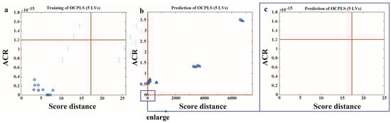 Adulteration assessment of baijiu samples via OCPLS: (a) the result for training samples; (b) the result for prediction samples; (c) the enlarged view of the regular point region in the result for prediction samples.