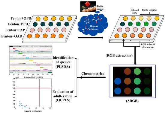 Herein, a four-channel organic-acid-sensitive visual sensor array based on Fenton reagent–phenol/aniline was constructed to realize the rapid detection of nine kinds of common organic acids in baijiu and the rapid species and adulteration assessment of baijiu. As shown in Scheme 1, through the fingerprint color of nine organic acids (such as acetic acid, lactic acid, hexanoic acid), either the single organic acid or the mixed organic acid samples could be quantitatively analyzed when combined with an optimized variable-weighted least-squares support vector machine based on particle swarm optimization (PSO-VWLS-SVM) [,] and a partial least squares discriminant analysis (PLSDA) model []. What is more, this novel sensor array could be used for both baijiu species identification through PLSDA and adulteration assessment through the one-class partial least squares (OCPLS) method []. This sensor array has excellent selectivity and sensitivity on organic acids, providing new guidance for monitoring the differences in trace organic acids in baijiu, and also has great application potential in other food industries.