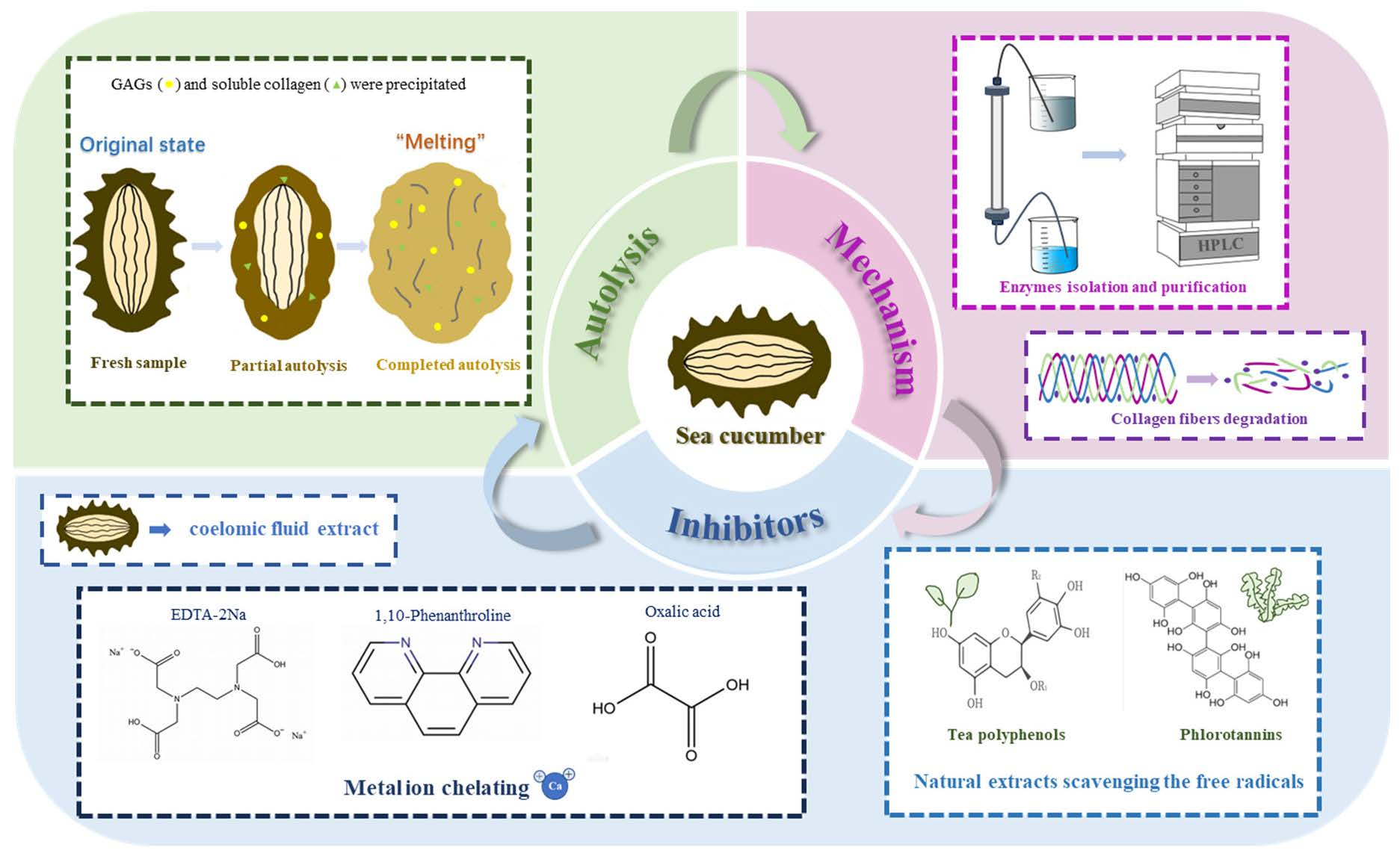 | Matrix metalloproteinase (MMP) | Boiled (10 min) sea cucumber stored at 4 °C for 60 d | Extracellular matrix in the dermis; Interfibrillar proteoglycan bridges | EDTA Na2 (10 mM); 1,10-phenanthroline (10 mM) | Ca2+ (↑) | - | Shear force (↓); hardness (↓); elasticity (↓); cohesiveness (↓); chewiness (↓); coverability (↓) | [21,26] | |