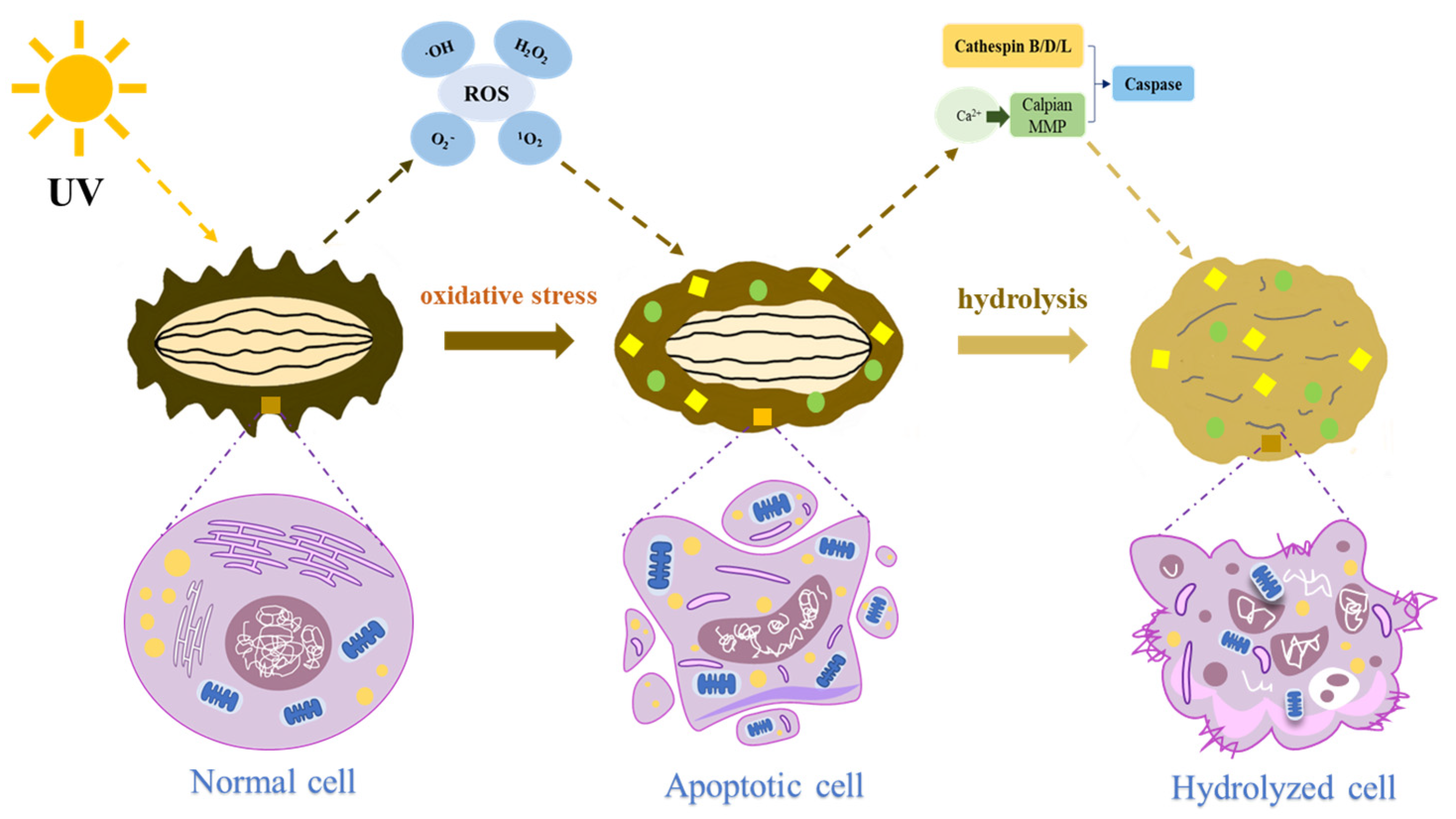 - Qi, H.; Fu, H.; Dong, X.f.; Feng, D.D.; Li, N.; Wen, C.R.; Nakamura, Y.; Zhu, B.W. Apoptosis induction is involved in UVA-induced autolysis in sea cucumber Stichopus japonicus. J. Photochem. Photobiol. B Biol. 2016, 158, 130–135. [Google Scholar] [CrossRef]