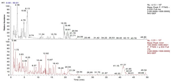 UPLC/Q-TOF-MS/MS chromatogram of the FGE in positive ionization mode.