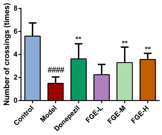 Effects of FGE on number of crossings of AD-like mice. FGE-L (120 mg/kg b. w.), FGE-M (240 mg/kg b. w.), and FGE-H (720 mg/kg b. w.). Data are expressed as means ± SD (n = 10) of six independent experiments. #### p < 0.0001 compared with control group, ** p < 0.05 compared with model group.