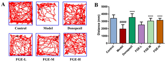 The total distance of movement in an open-field experiment is an important factor for evaluating the memory ability and behavior activity of animals [20]. As demonstrated in Figure 3, the total movement distance was significantly reduced in the model group compared with that in the control group (p < 0.01), indicating that an AD-like animal model was successfully established. Notably, the total movement distance of mice in the donepezil and FGE groups was significantly increased compared with the model group (p < 0.01). Accordingly, administrating FGE could improve the behavioral activity and cognition of AD-like mice.