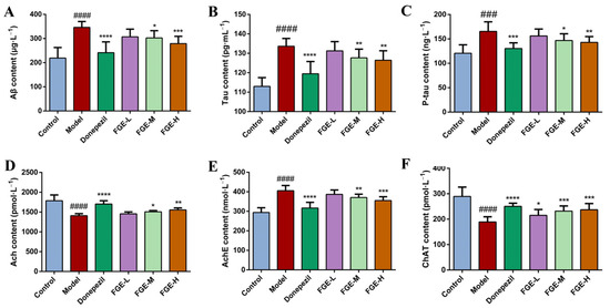 The damage of neuronal cells in brain tissue is generally caused by an abnormal increase in Aβ, which leads to the misfolding and assembly of Tau proteins throughout the cortex, eventually leading to nervous system failure, neurodegeneration, and cognitive decline. As displayed in Figure 4, the contents of Aβ, Tau, P-Tau, and AchE were significantly increased, while Ach and ChAT sharply decreased in the model group compared to the control group (p < 0.05). Interestingly, treatment with FGE could significantly improve the secretion of Aβ, Tau, P-Tau, and AchE and increase Ach and ChAT contents in the brain tissue. FGE could positively regulate neurotransmitter contents in AD-like mice.