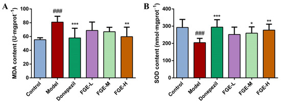 Oxidative stress (OS) is a series of adaptive reactions caused by an imbalance between reactive oxygen species and the antioxidant system of the body [21]. It interferes with the normal redox state of cells and damages proteins, lipids, and nucleic acids. The imbalance of OS drives AD, PD, atherosclerosis, heart failure, and cancer. As depicted in Figure 5, the MDA content was significantly increased (p < 0.01) and the SOD content was decreased in the model group compared to the control group. Compared with the model group, the levels of MDA and SOD were decreased and increased in the brain tissue in a dose-dependent manner in the donepezil and FGE groups.