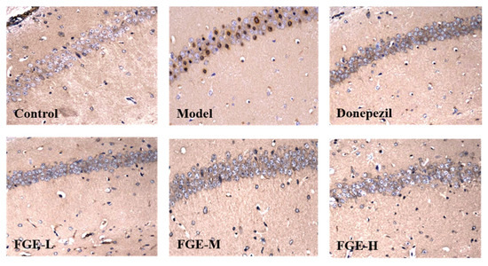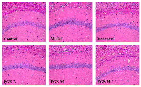 As displayed in Figure 6, the number of nerve cells was reduced, the arrangement was irregular, the integrity of the pyramidal cell layer was lost, and the cell body and nucleus were shrunken in the model group compared with the control group. Treatment with FGE improved neuronal cell damage, decreased cell shrinkage, improved cell morphology, increased cell layers and neat cell arrangement, and significantly increased cytoplasm and nucleus clarity compared with the model group. Accordingly, FGE could improve the symptoms of AD-like mice by protecting nerve cells in the brain tissue.