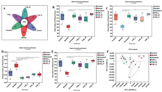 Effects of FGE on the gut microbiota in AD-like mice. Venn diagram of the OTUs (A); beta diversity indicated by Sobs (B), Chao (C), Simpson (D), Ace (E), and PCoA (F) analysis (n = 3); * p < 0.05, ** p < 0.05, compared with model group.