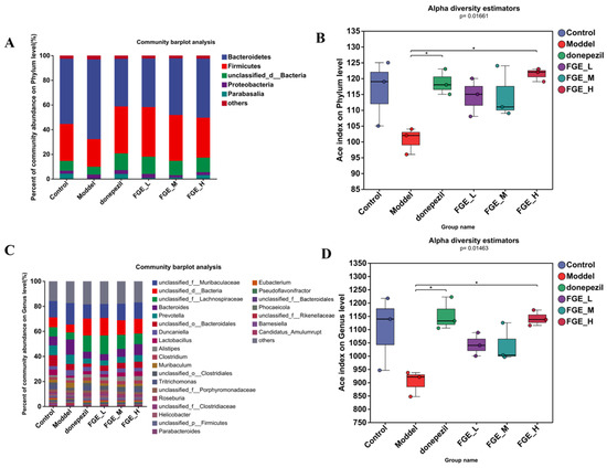 Relative abundance of bacteria at the phylum and genus levels. Histogram of relative abundance at the phylum level (A); Alpha diversity determined by Ace diversity index at the phylum level (B); Histogram of relative abundance at the genus level (C); Alpha diversity determined by Ace diversity index at the genus level (D). One-way ANOVA with LSD t-test was applied to evaluate significant differences between the groups; * p < 0.05 (n = 3).