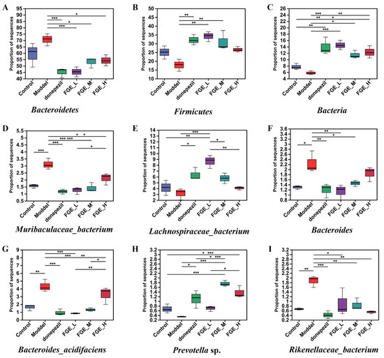 Abundance of bacterial taxa at different taxonomic levels (n = 3). (A) Phylum Bacteroidetes; (B) phylum Firmicutes; (C) phylum Bacteria; (D) species Muribaculaceae_bacterium; (E) species Lachnospiraceae_bacterium; (F) species Bacteroides; (G) species Bacteroides_acidifaciens; (H) species Prevotella sp.; (I) species Rikenellaceae_bacterium. * p < 0.05, ** p < 0.05, *** p < 0.001 compared with model group.