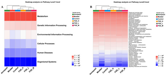 The intestinal flora is regulated by host genes, immune response, and dietary factors, and its metabolic and immune potential determines its importance in host health and disease [22]. Therefore, targeting the gut microbiota and its associated metabolic pathways is an effective strategy for treating diseases. In this study, the metabolic pathways in the six groups were analyzed using the KEGG database. As demonstrated in Figure 11A, metabolism, genetic information processing, and environmental information processing contributed to the top three level-1 pathways in these six groups. Further analysis of the KEGG secondary metabolic map indicated that the global and overview maps, carbohydrate metabolism, and amino acid metabolism are the top 3 metabolic functions among the 38 metabolic functions. As demonstrated in Figure 11B, the greatest difference in a metabolic pathway is amino acid metabolism among the six groups. AD is a multi-mechanism metabolic disorder closely linked to energy metabolism, in which amino acid metabolism plays an important role. Moreover, studies have found that amino acid levels have been identified as potential biomarkers for patients with AD. Consequently, we speculate that FGE may improve AD by intervening in the amino acid metabolism.