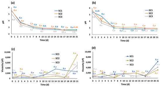 Evolution of pH values and viscosity (cP) during fermentation (21 days) in Tuber melanosporum (a,c) and Tuber aestivum (b,d) kombuchas with SCOBYs (SCs) 1 (blue), 2 (orange), and 3 (gray). Different letters denote significant differences for the same SC at different fermentation times (A–G) and for different SCs at the same fermentation time (a–c) (one-way ANOVA, Tukey’s test, p ≤ 0.05).