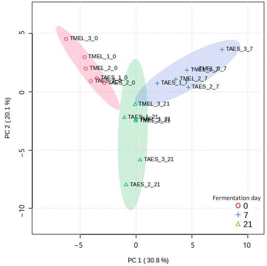 A PCA was used to explore possible correlations between VOCs and fermentation day (Figure 3).