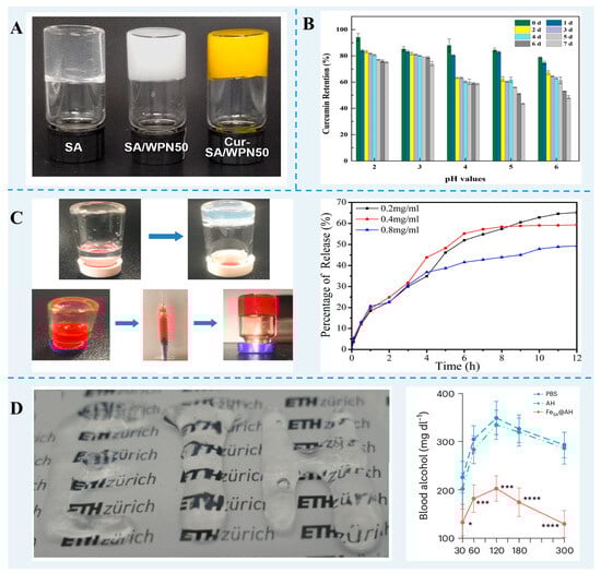 (A) The images of SA gel, SA/WPF hybrid gel, and Cur-SA/WPF gel. Reprinted with permission from []. Copyright 2023 Elsevier. (B) Curcumin retention of WPF-GNP-Cur hydrogel after ultraviolet radiation []. (C) Injectability of the HEWL fibril hydrogel with doxorubicin entrapment and the release plot of doxorubicin []. (D) Injectable β-lg nanofibril hybrid gel and the mean concentrations of blood alcohol in alcohol-intoxicated mice treated with hybrid gel []. * p < 0.05, *** p < 0.001, **** p < 0.0001.