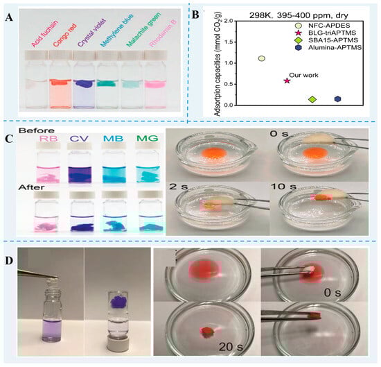 Zhou et al. [] prepared aminosilane-modified nanofibril-templated aerogels assembled from different food proteins. A β-lg nanofibril-templated aerogel with a CO2-adsorption capacity of 51.52 mg (1.17 mmol) CO2/g at 1 bar CO2, was superior to that of a black bean protein and lysozyme fibril-templated aerogel. Furthermore, the hybrid aerogel prepared using a β-lg nanofibril and UiO-66-NH2 had a greater capacity for CO2 adsorption and removal performance in different heavy metals and organic dyes than the pure β-lg fibrils aerogel [].
