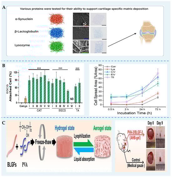 Since the freeze-dried β-lg nanofibril aerogel immediately re-disperses in water, Nyström et al. [] used butane tetracarboxylic acid as a crosslinker to stabilize the scaffolds. These soft, elastic, and water-stable aerogels were suitable for the penetration and permeation of Caco-2 and HT29. Gong et al. [] found that adding β-lg nanofibrils improved the microporous structures, softness, and biocompatibility of the AHB-gel dressings. The AHB-gel dressings could effectively improve the rate of wound healing and accelerate the formation of a new epidermis layer. Moreover, these AHB-gel dressings can be designed differently by combining cytokines or drugs and hybridization with other materials.