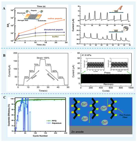 FPN gels are used as energy materials. (A) The aerogel film enzyme biosensor. Reprinted with permission from []. Copyright 2020, Wiley. (B) Current–time curves of lysozyme nanofibril hybrids aerogels []. (C) Pea protein nanofibril and vinyl alcohol hydrogel enhanced the zinc anode stability. Reprinted with permission from []. Copyright 2023 American Chemical Society.
