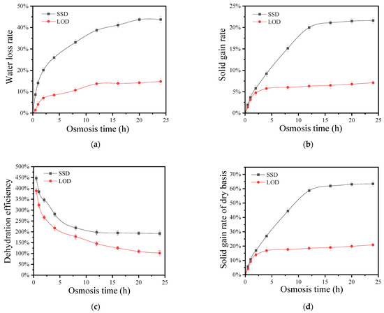 Changes in water loss rate (a), solid gain rate (b), dry basis solid gain rate (c), and dehydration efficiency (d) during SSD and LOD of coconut kernel.