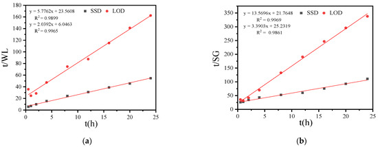 Relationship between t/WL and time t (a), relationship between t/SG and time t (b) during SSD and LOD of coconut kernel.