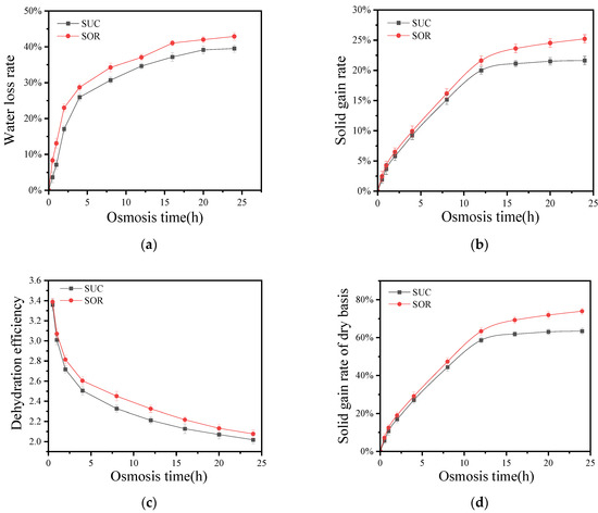 Sucrose is the most commonly used osmotic agent, but excessive consumption can lead to dental caries in children and pose significant health risks for individuals with diabetes and obesity. Sorbitol, on the other hand, offers a cool sweetness at about 60% of the sweetness of sucrose and is not metabolized by certain bacteria. This makes it a valuable ingredient in the production of sugar-free candies and various anti-caries foods [8,30]. In Section 3.1 of the study, the dehydration efficiency of SSD is better than that of LOD. Further, the osmotic dehydration mass transfer effect of sucrose and sorbitol in SSD is investigated. Figure 3 illustrates the water loss rate (a), solid gain rate (b), dehydration efficiency (c), and dry basis solid gain rate (d) during the solid osmosis process using both sucrose and sorbitol.