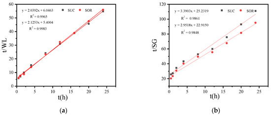Relationship between t/WL and time t (a), relationship between t/SG and time t (b) during SSD of coconut kernel using sucrose and sorbitol.