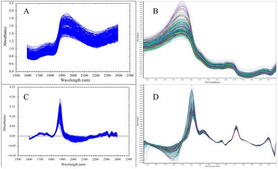 NIR original spectra and first derivative spectra of all C. gigas gonad tissue samples (using tetraploid as an example). (A) Original spectra from MP. (B) Original spectra from MN. (C) First derivative spectra from MP. (D) First derivative spectra from MN.