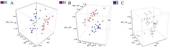 Principal component three-dimensional score plots of the MN instrument for samples with different ploidies and genders. (A) Tetraploid gender qualitative. (B) Diploid gender qualitative. (C) Qualitative analysis of different ploidies. Note: The * and + in the image indicate validation sets.