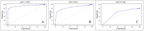 Spectra collected by the MP instrument were subjected to qualitative analysis using the Classify module in the Method Generator software. As shown in the figure (Figure 4), the diploid and tetraploid gender qualitative models could well distinguish between males and females, with correct recognition rates of 100%. However, the correct recognition rate of the different ploidy qualitative model was 81.17%, indicating that it could not separate the three types of samples effectively. The performance of the qualitative models of the MP instrument was assessed using subject operating characteristic (ROC) curves, and the ROC curves for the three models are shown in Figure 6. The curves demonstrate the relationship between sensitivity and specificity. In the figure, the x-axis represents specificity, while the y-axis represents sensitivity. The closer the ROC curve is to the upper left corner, the larger the area covered underneath it, which indicates that the model is more discriminative and able to distinguish between different samples more effectively. An AUC value close to 1 indicates higher predictive model accuracy. When AUC > 0.7, the model performance is considered good [29,30]. As shown in Table 4, the AUC value of the diploid gender qualitative model is 0.922, and that of the tetraploid model is 0.811, indicating that the model can well distinguish between males and females. However, the AUC value of the different ploidy qualitative model is only 0.426, indicating poor model performance and an inability to distinguish between different ploidies of C. gigas. The research results indicate that both instruments cannot distinguish well between oysters with different ploidies. Hawkins et al. demonstrated that the performance of triploid C. gigas in terms of growth, feeding rate, and absorption efficiency is superior to that of diploids, attributing these results to triploid oysters being partially or completely sterile, with all the energy otherwise used for reproduction allocated to the growth of tissues and shells [31], while the fertility of tetraploids with reproductive capability and diploids may result in their physiological similarities. Haure et al. demonstrated that the growth rate of tetraploids is comparable to that of triploids and higher than that of diploids [32]. Thus, the heterozygosity of triploid and tetraploid C. gigas may contribute to their similar growth rates. These reasons may lead to possible overlap of spectral features between different ploidy levels when using spectral analysis instruments, and this similarity may affect the resolution of spectral analyses by giving them similar absorption or reflectance properties in certain spectral regions, making it difficult for models to differentiate between different ploidy oysters in a given wavelength range. Accurately distinguishing the gender and ploidy of oysters can provide a scientific basis for genetic improvement and breeding of oysters, thus optimizing the production process and increasing the economic value of oysters.