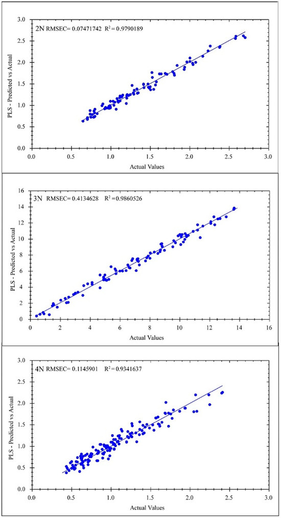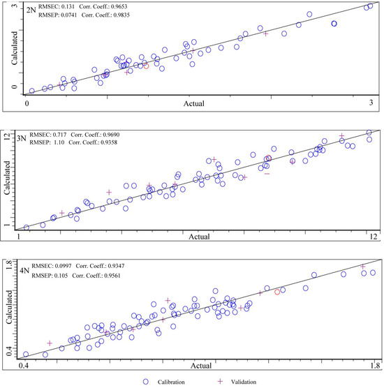 For MN, a combination of original spectra (SP), first derivative (FD), second derivative (SD), no smoothing (NS), Savitzky–Golay filter (SG), and Norris derivative filter (NDF) were used in preprocessing the spectra and corresponding true values. This approach reduced noise in the spectral information while retaining potential spectral data relevant to chemical information, allowing for the selection of the optimal spectral preprocessing method. Additionally, Mahalanobis distance was employed to identify outliers in the model, leading to the exclusion of certain samples.