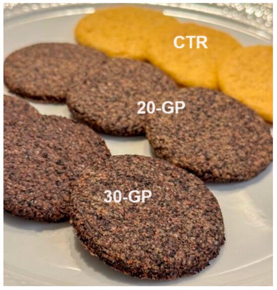Biscuits were produced from a base formula (control biscuit, CTR) containing organic wheat flour (40 g 100 g−1), white sugar (20 g 100 g−1), extra-virgin olive oil (20 g 100 g−1), organic soy drink with no added sugars (15 g 100 g−1) and organic baking powder (5 g 100 g−1). The total phenolic compounds of olive oil was 21 mg 100 g−1, as determined with the Folin–Ciocalteu assay (see below). Whole crushed GP was used at the amount of 20 g 100 g−1 in the 20-GP biscuits and at the amount of 30 g 100 g−1 in the 30-GP biscuit formula. As a result, in the two formulas, crushed whole GP replaced the 20% or the 30% (w/w) of each ingredient included in the base formula (Supplemental Table S1). These two percentages were selected as a compromise to maximize the health potential benefits while ensuring the dough workability. Biscuits were formed and patterned to 6 cm diameter and 0.3 cm thickness, and baked in the oven at 130 °C for 25 min (Figure 1).