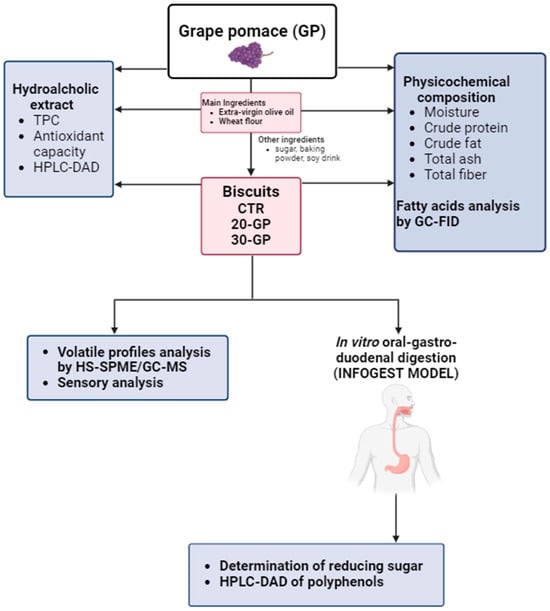 Schematic workflow of the experimental approach employed for the study and characterization of crude crushed grape pomace and their relative biscuit prototypes.