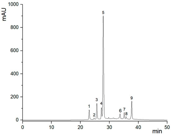 Representative HPLC chromatograms of a GP anthocyanins extract monitored at 520 nm. Peaks labelled in the figure are assigned from Table 4.