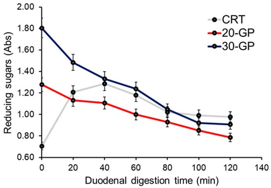 Since the DNSA analysis accounts for reducing sugars in the supernatant of the digestion mixture, which is sampled during the duodenal digestion, the sugar decrease observed for the 20-GP and 30-GP biscuits might be attributed to non-covalent binding of sugars with progressively released methanol-insoluble fibers of GP, which subtract reducing sugars to the supernatant. Interestingly, the “sequestering” of sugars by fibers might have the physiological effects of diminishing the availability of simple saccharides for the intestinal uptake, thereby inducing a favorable reduction in the glycemic response.