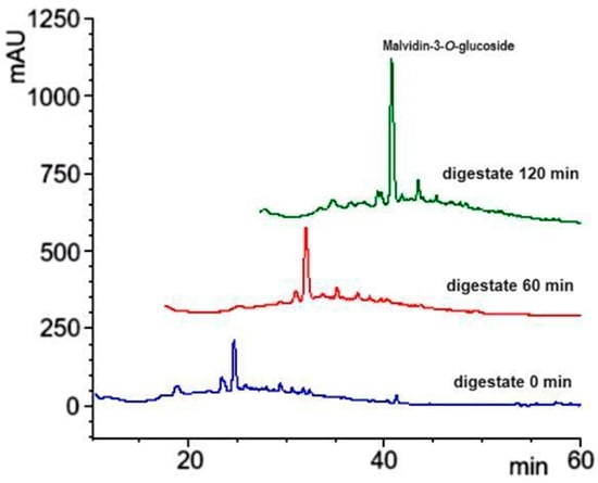 HPLC-DAD analysis (520 nm) of soluble extracts from 30-GP biscuits during simulated duodenal digestion demonstrating the progressively increasing release of anthocyanins.