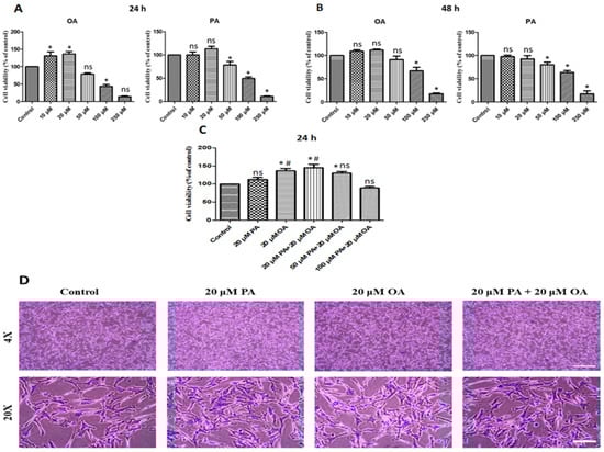 Effects of oleic acid (OA) and palmitic acid (PA) on cell viability at different physiological concentrations. (A,B) Porcine satellite cell viability: cells were incubated in separate experiments with 10 µM, 20 µM, 50 µM, 100 μM, and 250 μM OA and PA for 24 h and 48 h, respectively. (C) Porcine satellite cell viability: cells were incubated in separate experiments with 20 µM PA, 20 µM OA, 20 µM PA + 20 µM OA, 50 µM PA + 20 µM OA, and 100 µM PA + 20 µM OA for 24 h incubation. (D) Morphology visualized by Giemsa staining; scale bar = 100 and 20 μm for 4× and 20× of microscopic enhancement, respectively. Values are means ± SE, n = 5. * Indicates significance between treatment groups vs. control (p < 0.05), # Indicates significance between OA/PA + OA groups vs. PA group (p < 0.05), and ns indicates no significant difference. The control group consisted of porcine satellite cells that were untreated (no PA or OA).