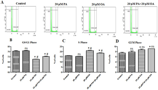 Effects of OA and PA on the cell cycle. (A) Cell cycle results with 20 µM PA, 20 µM OA, and 20 µM PA + 20 µM OA for a 24 h incubation period. (B–D) Changes in different cell cycle phases of PMSCs following PA and OA treatment. Values are means ± SE, n = 3. * Indicates significance between treatment groups vs. control (p < 0.05), # Indicates significance between OA/PA + OA groups vs. PA group (p < 0.05), and ns indicates no significant difference. The control group consisted of porcine satellite cells that were untreated (no PA or OA).
