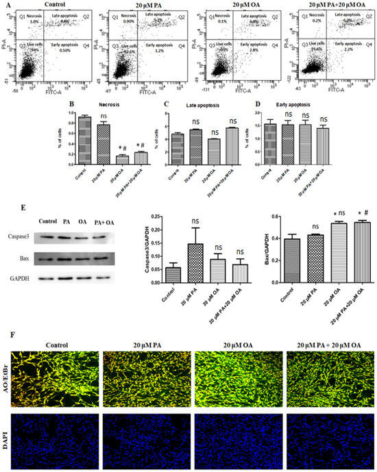 Analysis of cell necrosis, late apoptosis, and early apoptosis by FACS. (A) Porcine satellite cell apoptosis detection results with 20 µM PA, 20 µM OA, and 20 µM PA + 20 µM OA for a 24 h incubation period. (B) Proportion of necrotic cells. (C) Proportion of late apoptotic cells. (D) Proportion of early apoptotic cells. (E) Apoptosis-related protein expression. (F) Morphological observations using AO/EtBr staining and DAPI staining with confocal microscopy. Values are means ± SE, n = 3. * Indicates significance between treatment groups vs. control (p < 0.05), # Indicates significance between OA/PA + OA groups vs. PA group (p < 0.05), and ns indicates no significant difference. The control group consisted of porcine satellite cells that were untreated (no PA or OA).