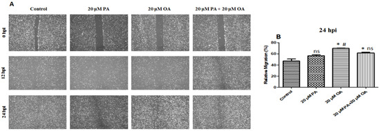 (A) Cell migration analysis performed by a wound healing assay; hpi indicates hour post incubation; scale bar = 100 μm. (B) Cell migratory area detection results with 20 µM PA, 20 µM OA, and 20 µM PA + 20 µM OA for a 24 h incubation period. Values are means ± SE, n = 5. * Indicates significance between treatment groups vs. control (p < 0.05), # Indicates significance between OA/PA + OA groups vs. PA group (p < 0.05), and ns indicates no significant difference. The control group consisted of porcine satellite cells that were untreated (no PA or OA).